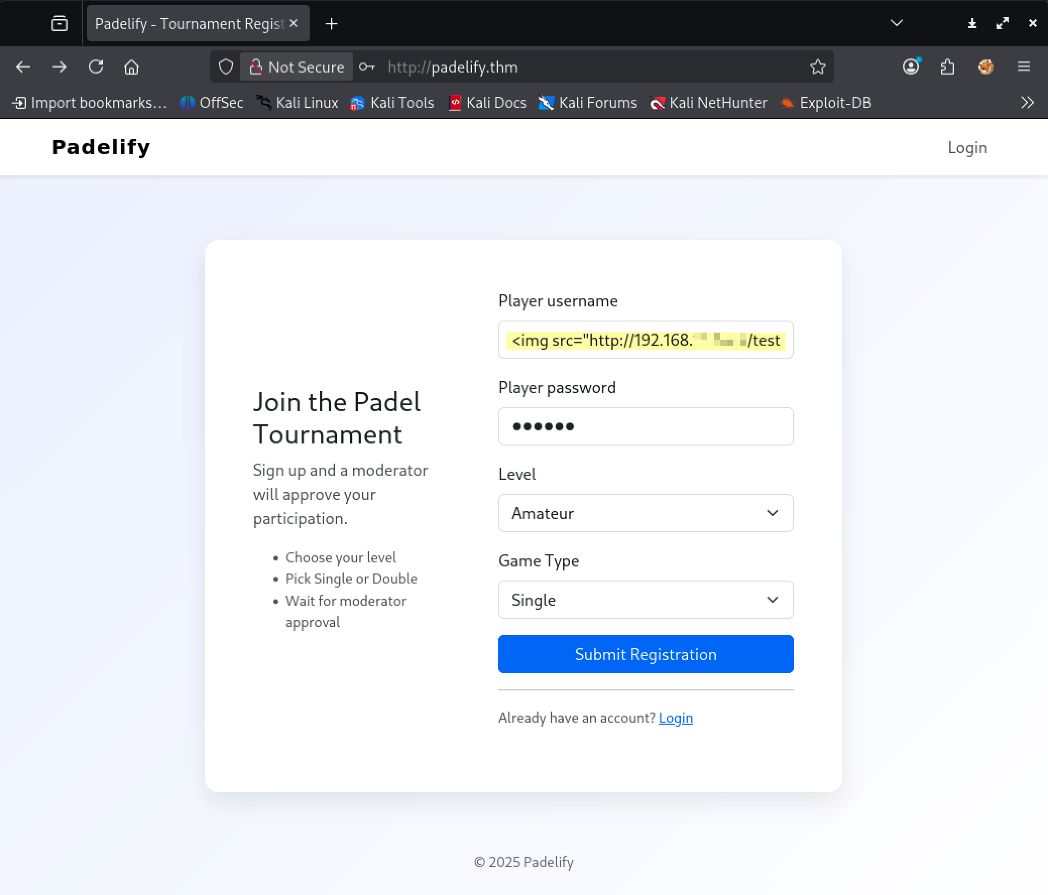 Before we attempt to steal the moderator's session let's confirm our theory and try and register but use an XSS attack vector for the Player username: